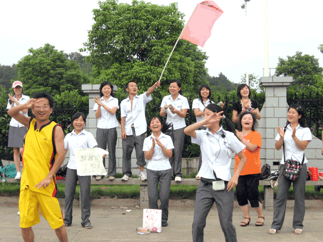 啦啦队员们也用尽了浑身解数为自己的队伍加油:各具特色的自备加油武器,有矿泉水瓶、凉茶桶、小喇叭,超越队的啦啦队更是连茶壶和饭盆都用上了,加油呐喊声此起彼伏,响彻云霄。加油方式也五花八门,一进球,有的啦啦队便一齐唱起了自编的啦啦歌;雄鹰队的拉拉队员们用矿泉水瓶当乐器跳起了可爱的啦啦舞。我们的啦啦队成为了比赛场上另一道靓丽的风景线!