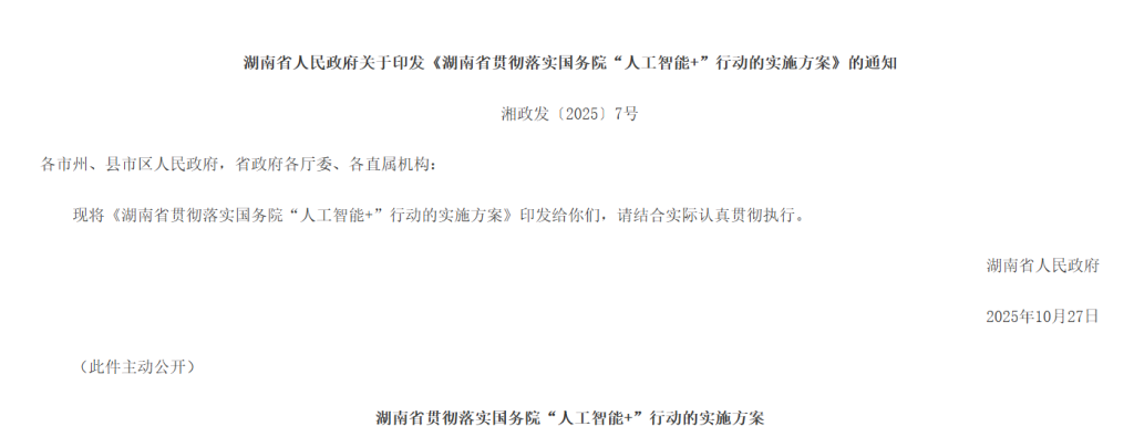 11月7日,《湖南省贯彻落实国务院“人工智能+”行动的实施方案》新闻发布会在长沙举行。从会上获悉,湖南将聚焦5大领域14个赛道,加快建设全国一流的人工智能创新策源地、产业集聚地和应用示范地。