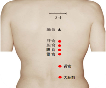 主穴:肝俞、脾俞、胃俞、肾俞、大肠俞、足三里