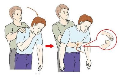 他救法:施救者站在病人身后,用两手臂环绕病人的腰部,一手握拳抵住肋骨下缘与肚脐之间,另一手抓住拳头,快速向里向上挤压,形成一股冲击性气流,将堵住气管、喉部的食物硬块等冲出;重复以上手法直到异物排出。