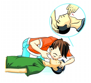 2、人工呼吸:清理呼吸道分泌物→抬起下颌骨打通气道→下颌角到耳垂的连线垂直于地面→压前额捏鼻孔,吹气。