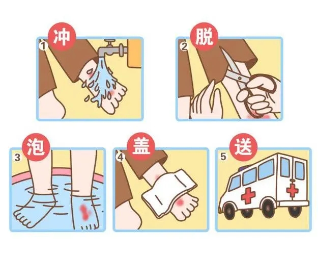 脱:将身上的衣物小心脱掉,如有粘连暂不处理;泡:然后将患处泡在冷水里;