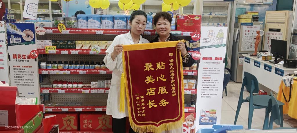 “诺舟大药房的唐店长真是太好了!服务好,又热情!” 近日,一位阿姨手持一面写有 “贴心服务 最美店长” 的锦旗,专程来到诺舟大药房中南汽车世界门店,向她表达由衷的感谢。这面锦旗的背后,藏着一段诺舟店长用专业帮助顾客重获健康、用热情赢得信赖与赞誉的故事。