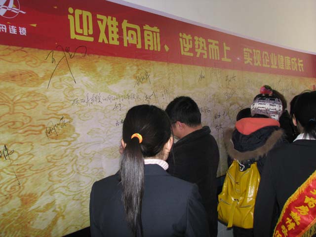 在宣布了《2009年人事聘用决定》后,举行了双舟连锁中层干部誓师,中层干部们身着黑色西服,面对所有双舟同仁庄严宣誓:我们将紧紧围绕 “迎难向前、逆势而上,实现企业健康成长”的指导思想,强实干,重合作,勤沟通,精益求精抓管理,精打细算控成本,精耕细作做服务、努力营造最适合员工工作的内外环境!表达了他们在2009年的工作中真抓实干、开拓进取的决心。