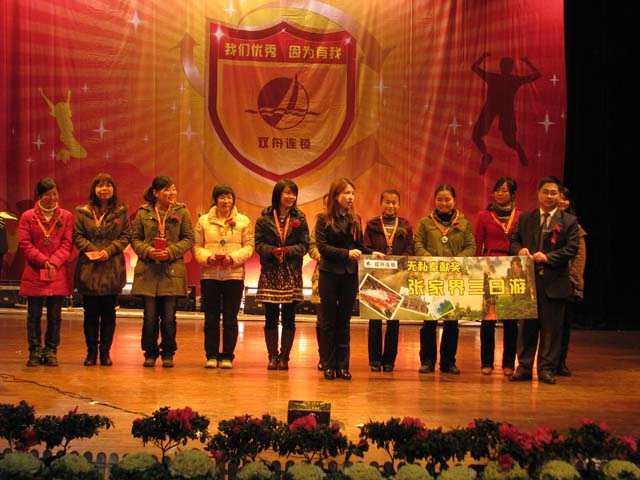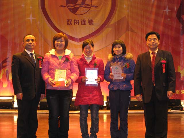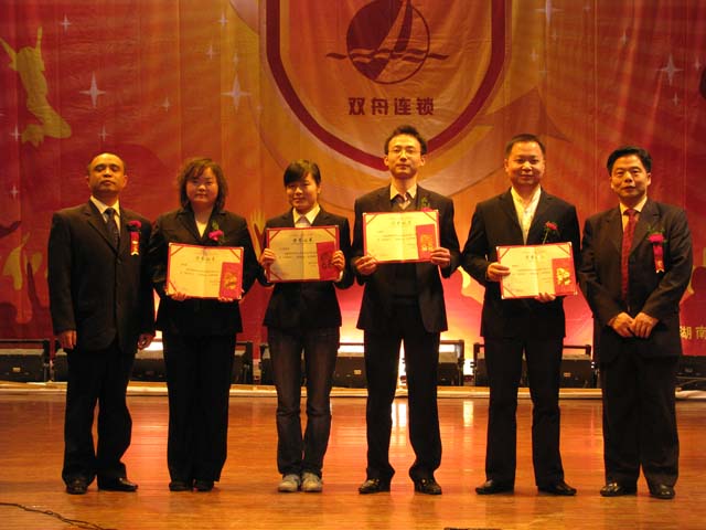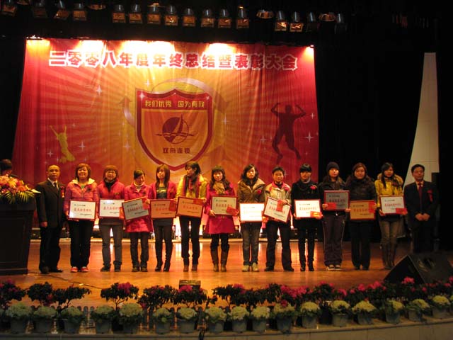 大会在《激情与梦想》的主题宣传片中拉开帷幕。宣传片从管理、市场拓展、企业文化三个方面展示了公司在08年度取得的成绩,气势恢弘的音乐、骄人的成绩催人奋进,作为一名双舟人的自豪感油然而生。双舟连锁总经理易军做了年度总结并宣布了《双舟连锁08年度表彰决定》,一百多位先进工作者脱颖而出,分别获得了服务之星、无私奉献、执行先锋、专业之星、金牌店长、优秀店长、卓越领导、销售突围等光荣称号,16个部门和门店分别荣获最具激情团队、最具挑战精神团队、最佳业绩团队、最具合作精神团队、最佳服务团队和优秀部门的光荣称号。荣誉和掌声是对他们辛勤付出的最好肯定。
