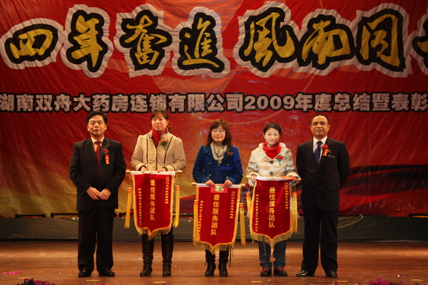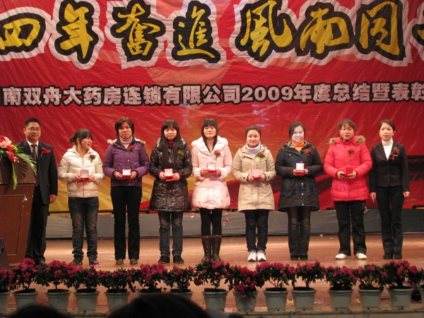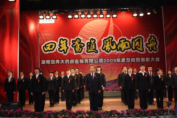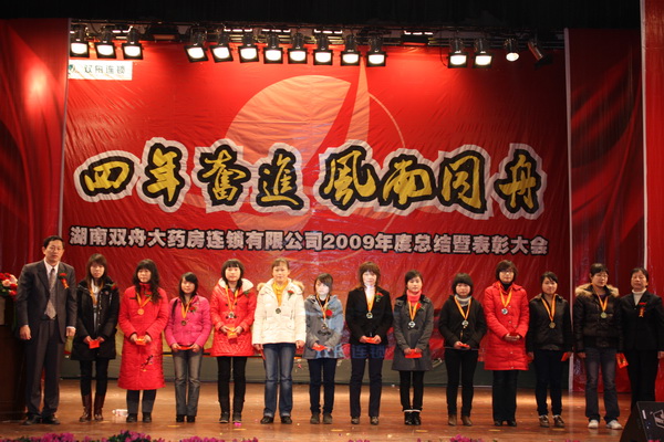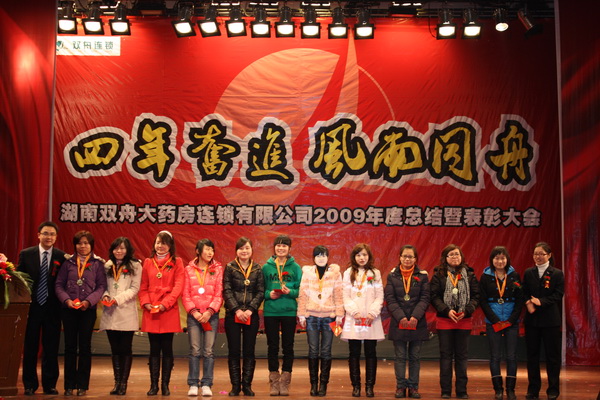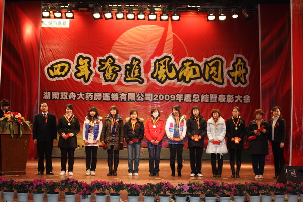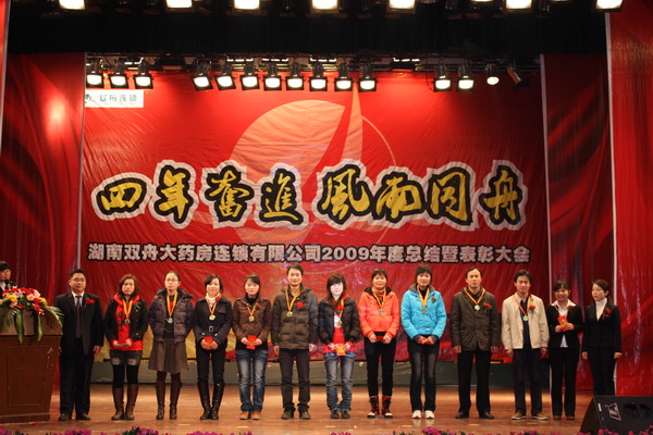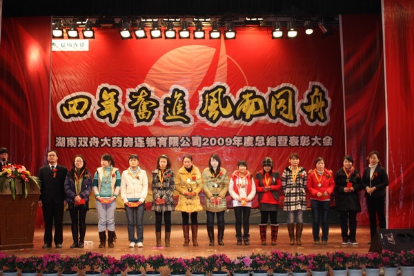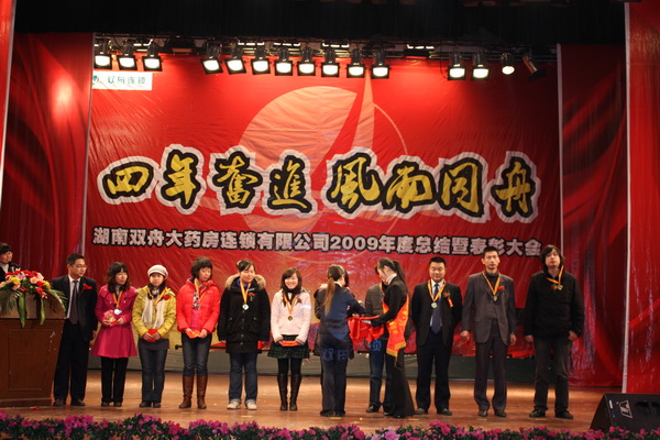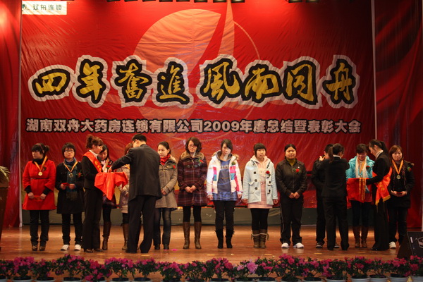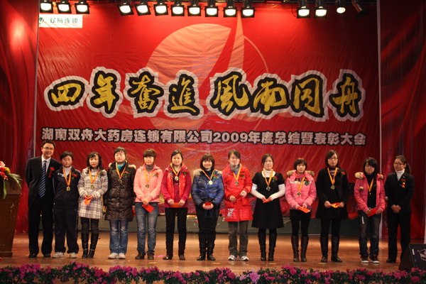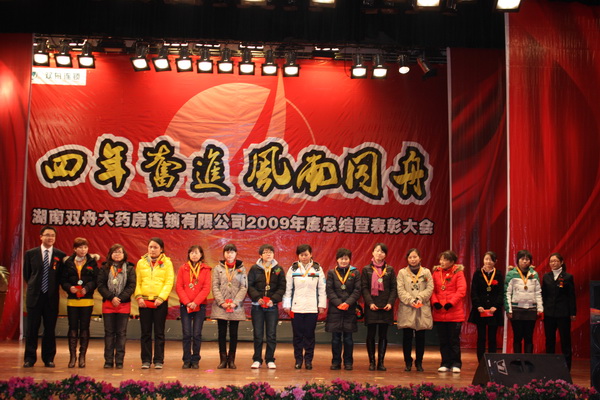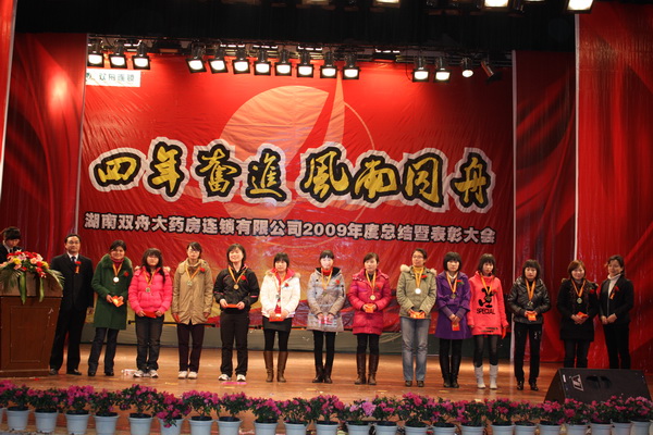 大会在《四年奋进,风雨同舟》的主题宣传片中拉开帷幕。双舟连锁总经理易军做了2009年度总结。一百多位先进工作者脱颖而出,分别获得了服务之星、执行先锋、专业之星、优秀店长、最佳新秀店长、优秀部门长、双舟风采奖等光荣称号,15个门店和部门分别荣获最具激情团队、最佳服务团队、最佳业绩团队、业绩飞跃团队、和优秀部门的光荣称号。荣誉和掌声是对他们辛勤付出的最好肯定。