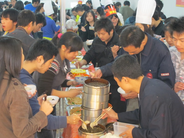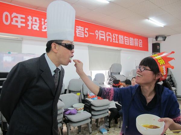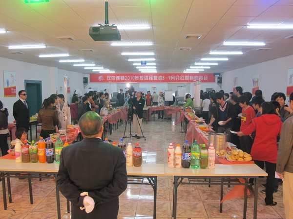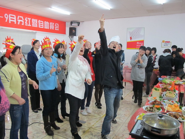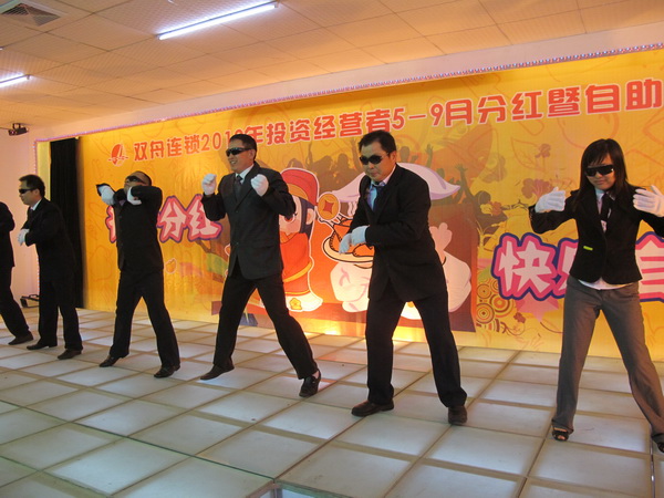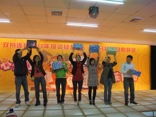 2010年11月3日中午,以“开心分红,快乐自助”为主题的“双舟连锁投资经营者5—9月分红暨自助餐会”在总部培训室快乐举行。本期分红会议采取自助餐会的形式,让各位投资经营者们欢聚一堂,吃好、玩好、拿好!现场热闹非凡,各大组都精心准备了新鲜美味、丰富多彩的美食,门管、商品部的虫草天鹅羹,人资、信息、湘潭事业部的龙凤呈祥,策划、拓展、工程部的锦鲤飘香成为了众多菜色中的点睛之笔。同时餐厅还配备了一支十分专业的侍者保安团,不但为大家端茶倒水,服务周到,而且还带来了“婀娜多姿”的舞蹈秀,博得满堂喝彩。