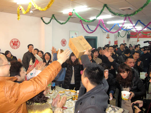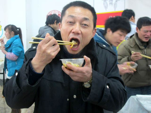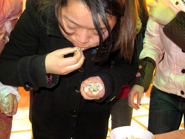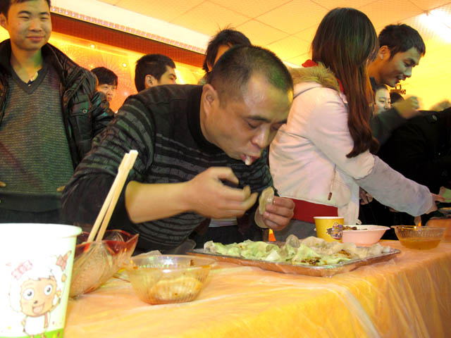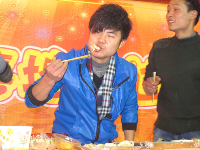 在欢天喜地吃饺子的同时,食堂总舵也为大家准备了丰厚的奖品,吃到姜、红枣、红辣椒馅饺子的同仁都获得了幸运奖;同时“世界吉尼斯双舟吃饺子挑战赛”也进行得热火朝天,前去挑战的男女选手都获得了好的成绩,最后,易军先生过五关斩六将,获得了男子组冠军,女子组冠军则由巾帼英雄周晶美女收入囊中。