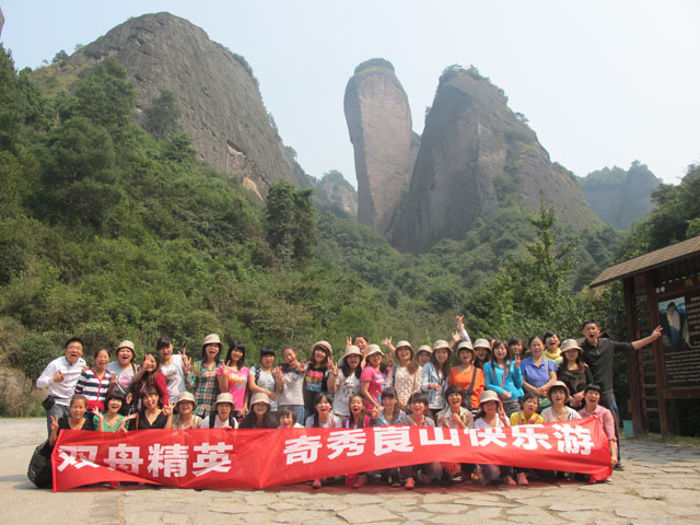 一路上快乐的双舟精英们领略了大自然的神奇,感受到了独特的丹霞地貌奇观,那惟妙惟肖的辣椒峰凌空突兀、傲视群峰,让人为之惊叹;登临八角寨顶,不仅体验了一脚跨两省的伟大,而且还欣赏了山随雾动,风傍云移,浮云飘渺之中,群山逶迤起伏似“鲸鱼闹海”般壮观之奇景;泛舟在碧水悠悠的扶夷江,让精英们享受了一番人在画中游的感觉;“人在缝中如入地,幸凭丝毫辨青天”,穿越鬼斧神工的天一巷,让精英们更是感慨万千,回味无穷啊!