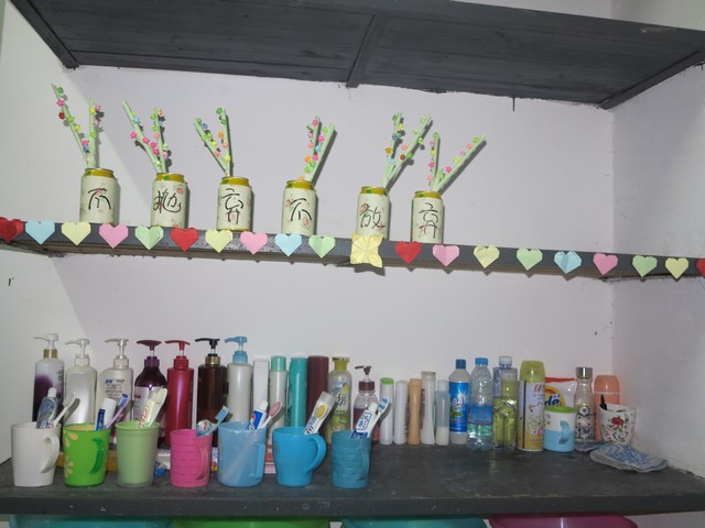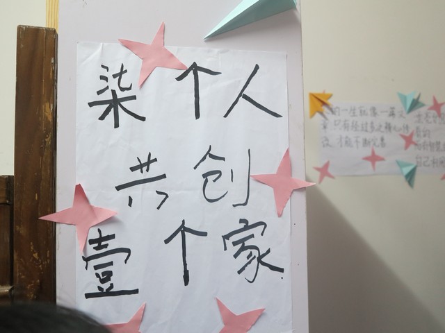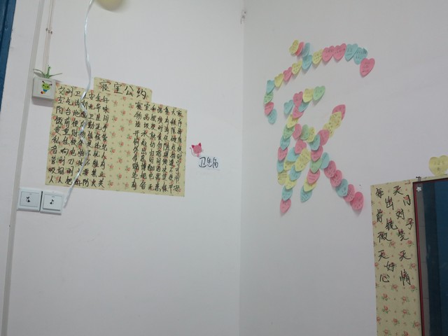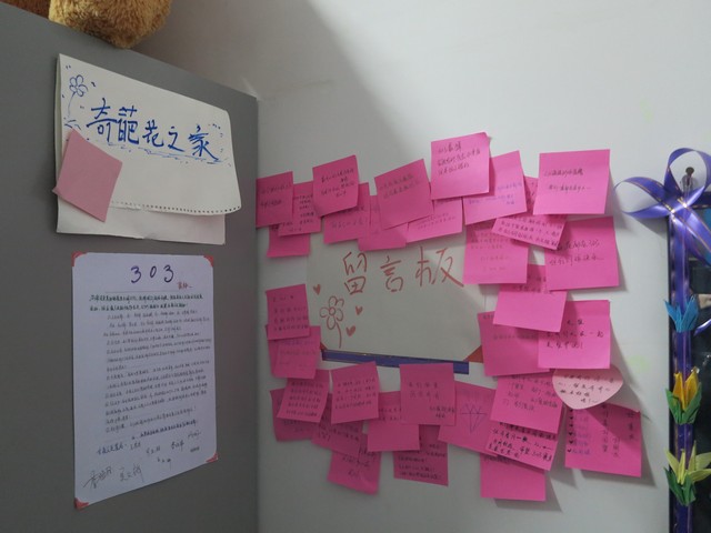 本着花小钱办大事的原则,同学们围绕班级主题对教室、寝室展开了纯手工制作的氛围布置。全班总动员——心灵手巧的女生折起了千纸鹤、幸运星、爱心桃……就连我们大条的男生也耐心地学习折纸,为氛围大赛贡献出自己的力量。