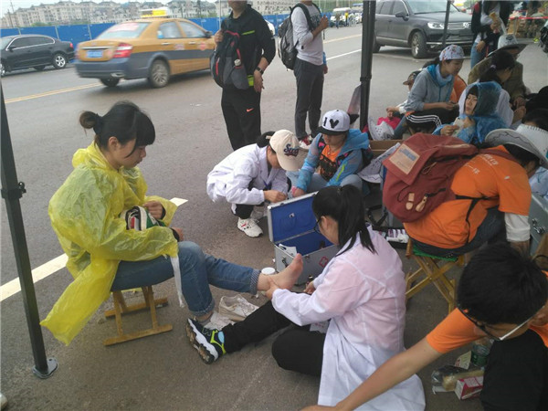 即使双脚磨出水泡,毅行者们依然搞怪带着笑容前行