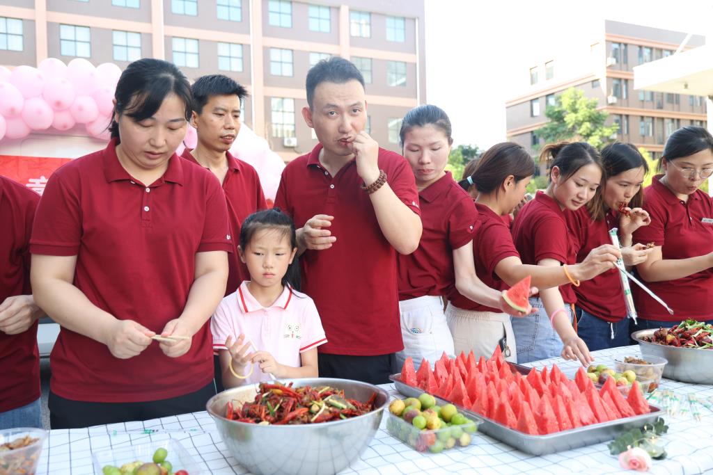 蒜蓉小龙虾、香辣小龙虾、紫苏小龙虾……各个口味的小龙虾端上桌了,精致的水果拼盘摆起来啦,香喷喷的凉菜也端上桌啦,自己亲手制作的美食就是不一样!除此之外还有第九套广播体操大赛来助兴,用抽签的形式选择部门代表连队出战,三轮比拼下来,赛出了风格,赛出了风采,赛出了团队的力量!